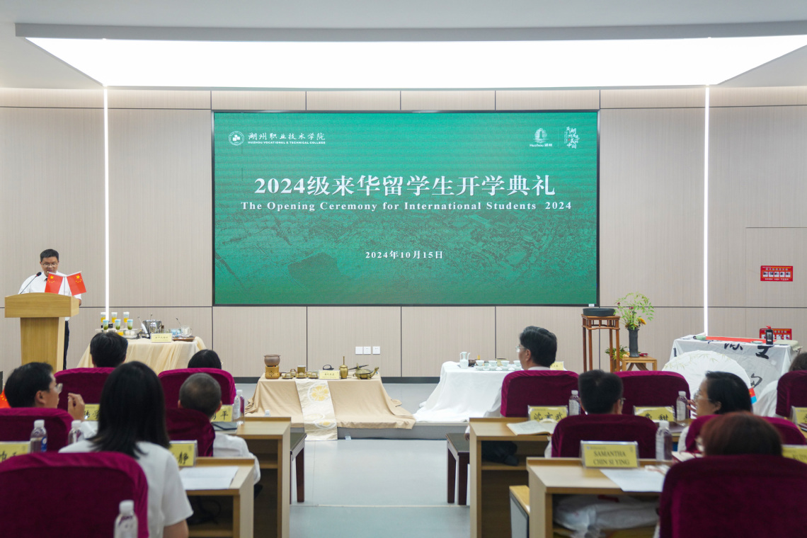 10月15日,学校2024级来华留学生开学典礼隆重举行,学校正式迎来了首批来华留学生。校园内秋意正浓,叠翠流金。会场内座无虚席,气氛热烈。来自俄罗斯、马来西亚、秘鲁、坦桑尼亚、蒙古、乌兹别克斯坦、印度尼西亚、尼泊尔等8个国家的50余名新同学从世界各地而来,齐聚镜湖畔,以新湖职人的身份,开启人生新的篇章。副校长、党委委员何彦虎,办公室(国际交流与港澳台事务办公室),学工部,教务处,全日制二级学院负责人,留学生管理专员,教师代表,辖区派出所警官,外方带队教师,2024级全体留学生参加典礼仪式。